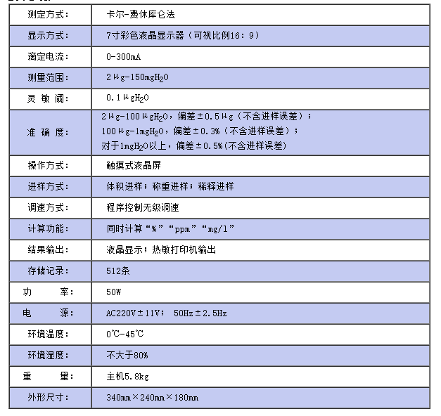 儀器符合GB/T7600及采用卡爾—費(fèi)休法測(cè)定樣品中水分的有關(guān)標(biāo)準(zhǔn), 是淄博庫侖分析儀器有限公司經(jīng)過幾代庫侖法微量水分測(cè)定儀的完善和改進(jìn),生產(chǎn)出的全新的具有人機(jī)對(duì)話功能新一代水分測(cè)定儀器。 該儀器采用雙CPU控制,測(cè)量精度、運(yùn)算功能大幅度提高,同時(shí),大屏幕彩色液晶顯示、觸摸屏控制、中文菜單,具有電極開路、短路報(bào)警等故障自檢功能,可儲(chǔ)存512條信息,自動(dòng)計(jì)算并打印PPm、%、mg/L的測(cè)定結(jié)果。該儀器獲得三項(xiàng)國(guó)家專利。