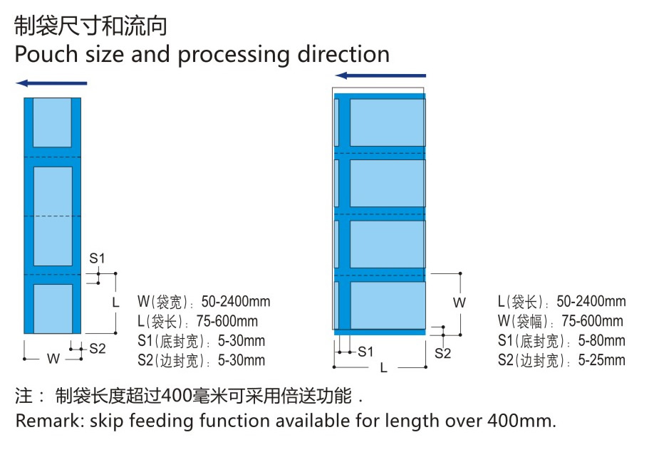 11.倍送方式:一至六倍送,制袋長度超過400毫米可采用倍送功能。
